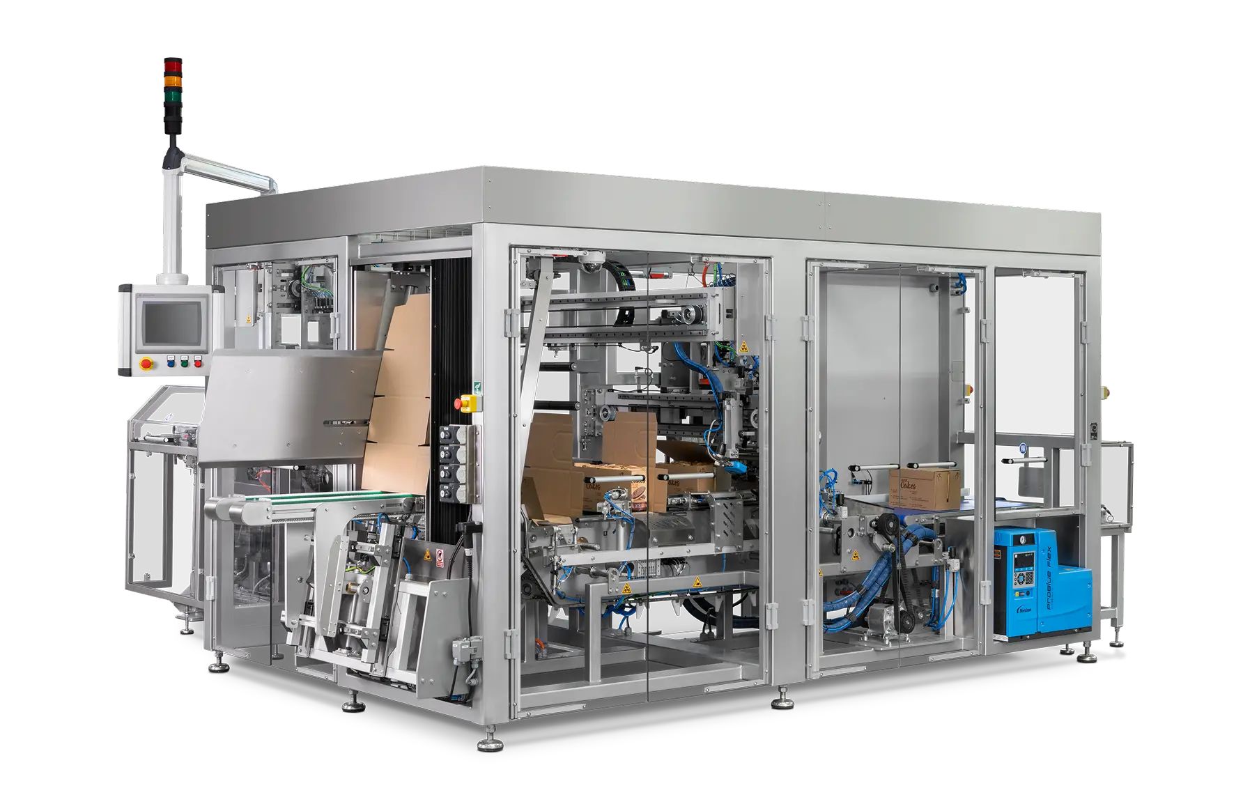 Efektywny system Case Packer typu wrap-around – automatyczna maszyna formująca i pakująca produkty bezpośrednio w kartony zbiorcze.
